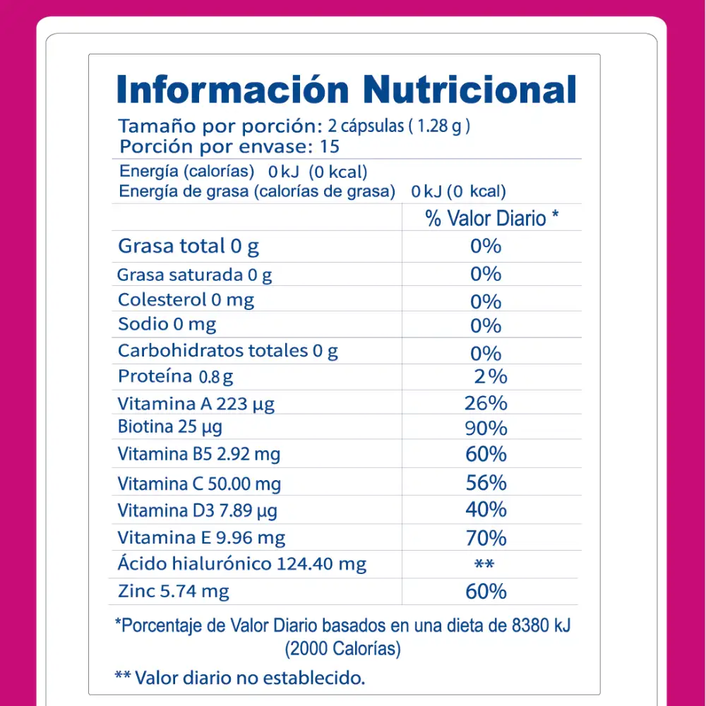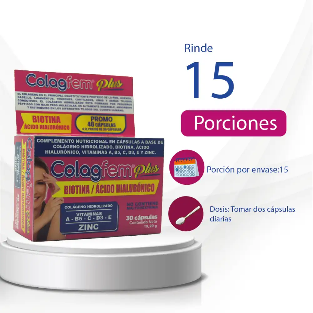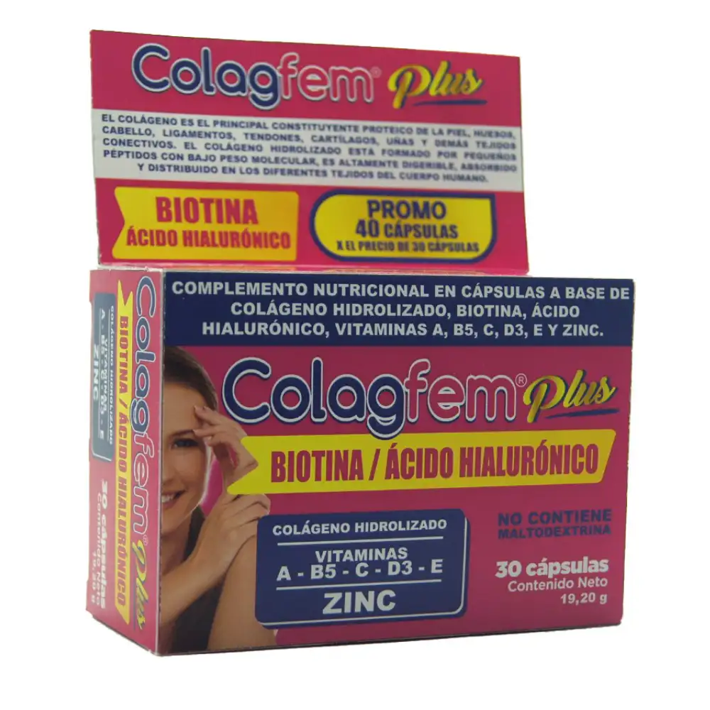 COLAGFEM PLUS COLÁGENO HIDROLIZADO, BIOTINA, ACIDO HIALURÓNICO,VITAMINAS A, B5, C, D3, E Y ZINC X 30 CÁPSULAS
